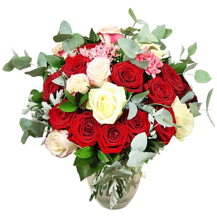 Want to make their day unforgettable and unique? You can surprise your love with this breathtaking combination of red and white roses, eucalyptus and bouvardia which will make this holiday a unique one!