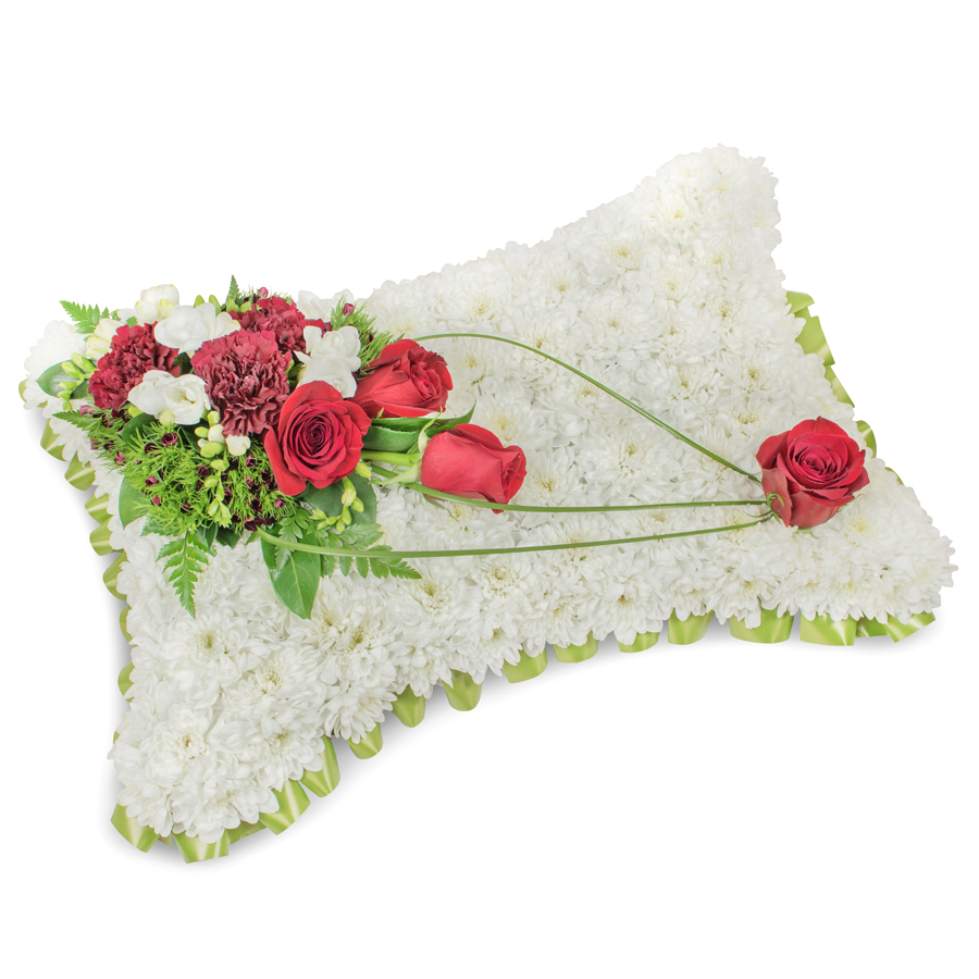 Convey your heartfelt sympathy with our timeless flower arrangement, designed to provide comfort and express your deepest condolences. This elegant bouquet combines white chrysanthemums, red roses, white freesias, dark red carnations, along with dianthus and bear grass, creating a beautiful and lasting impression.